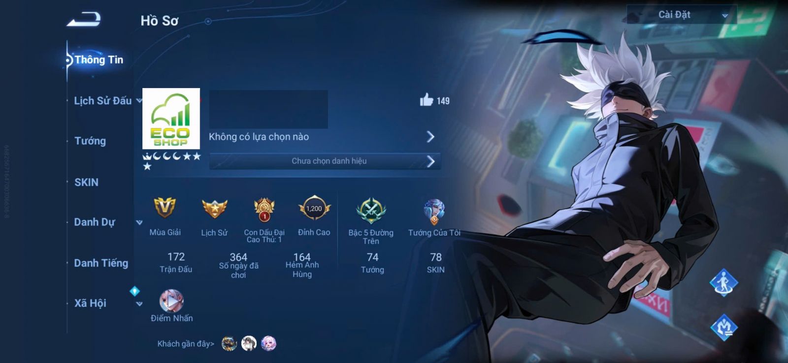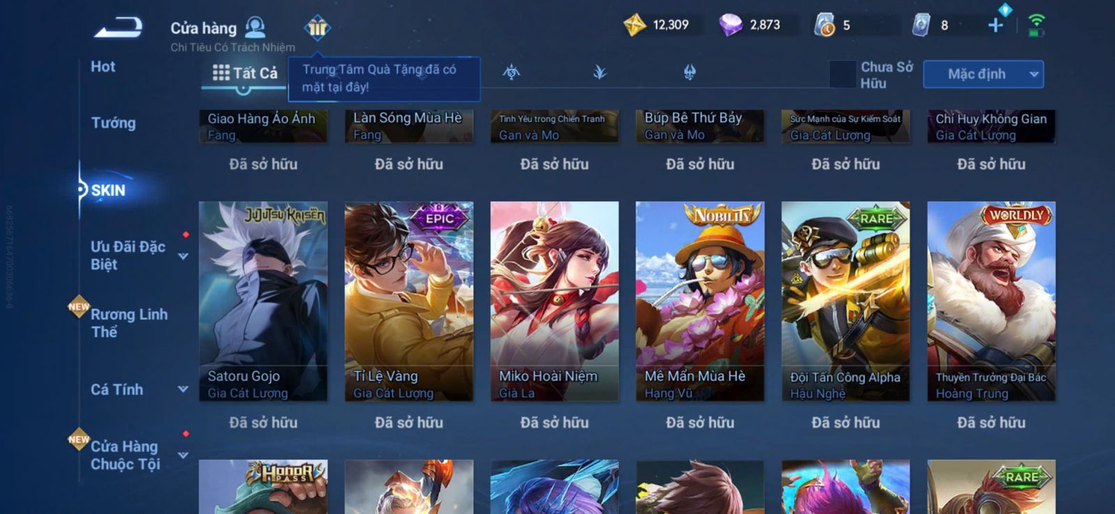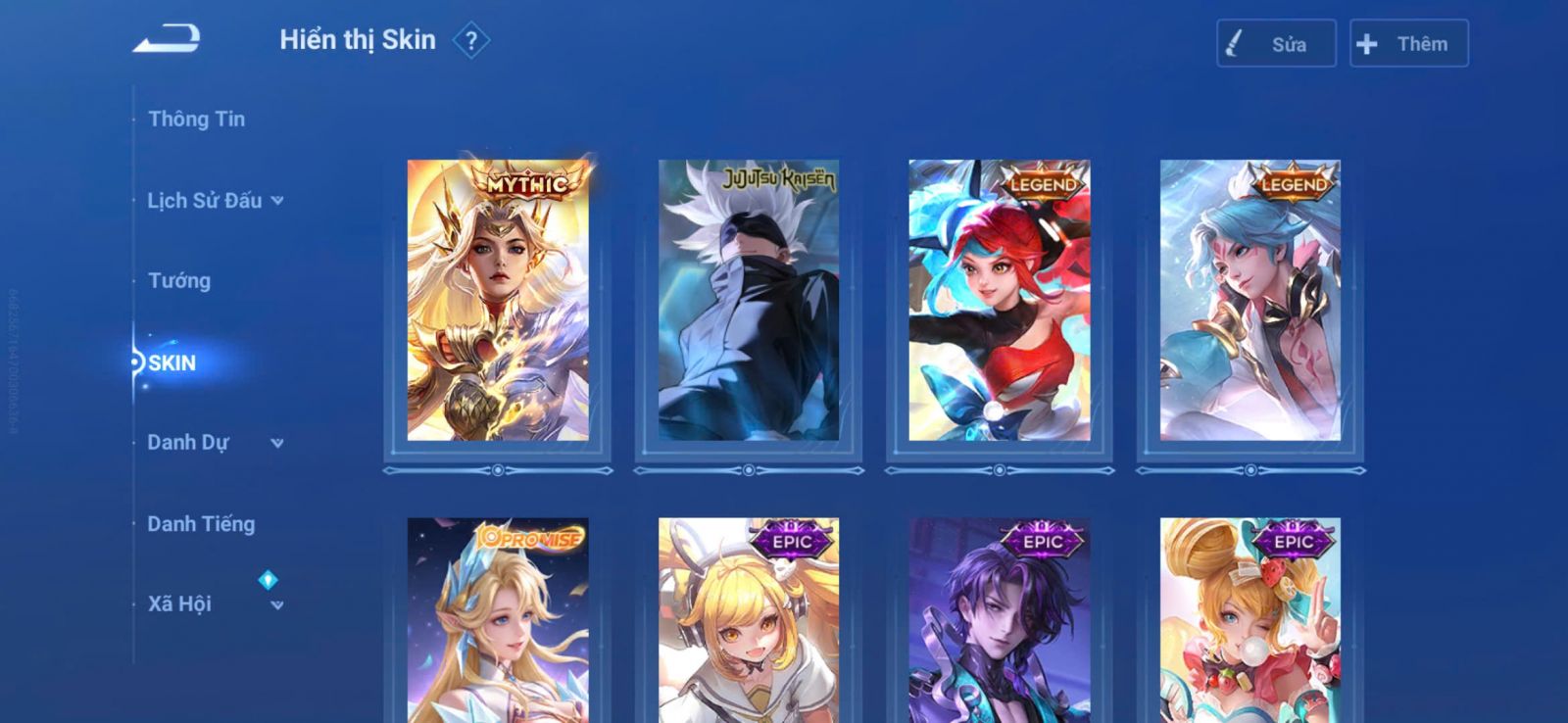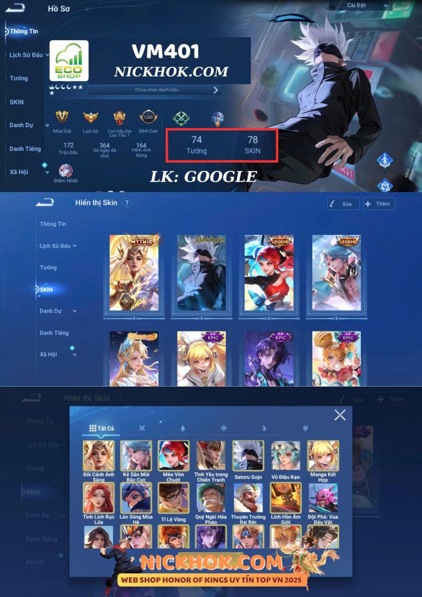 Nổi bật: VM401 - Mythic Mộc Lan, JJK Gojo, 2 Legend Allain, Angela, Promise Erin, 13 Epic