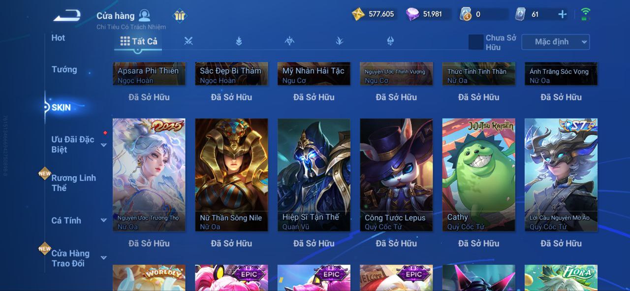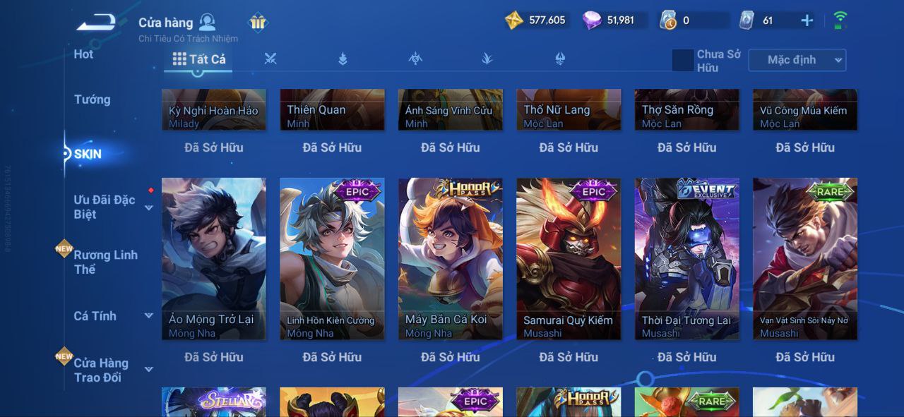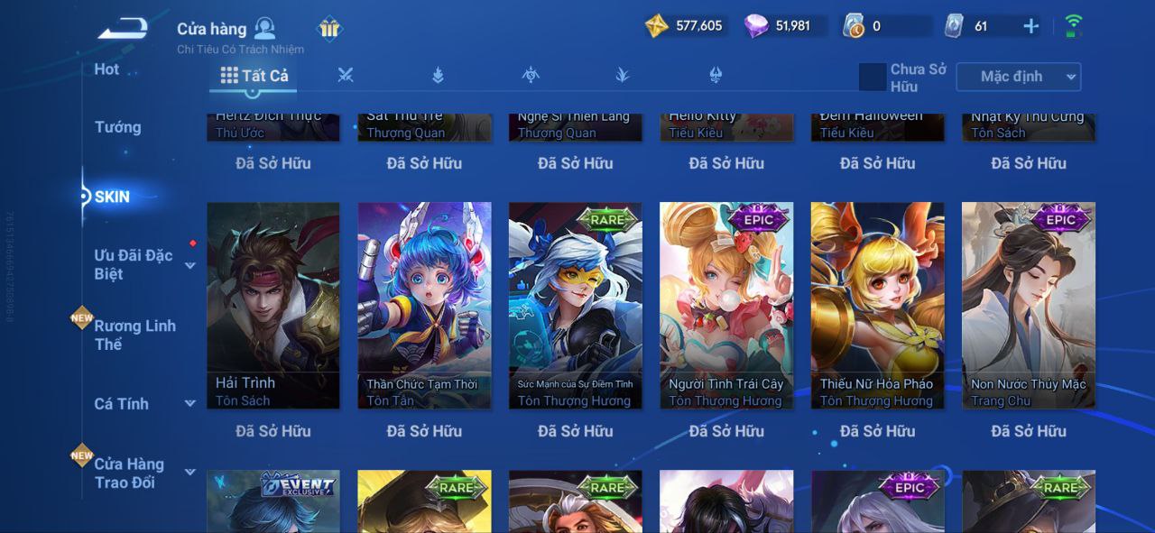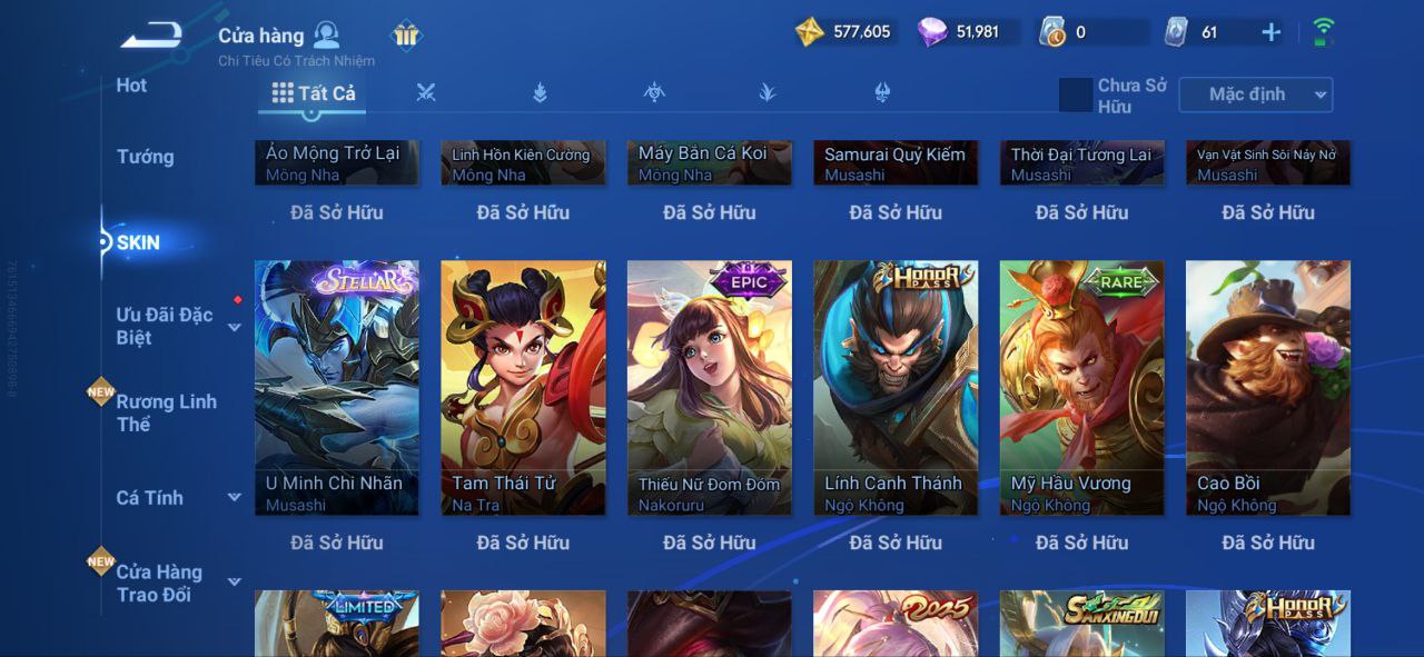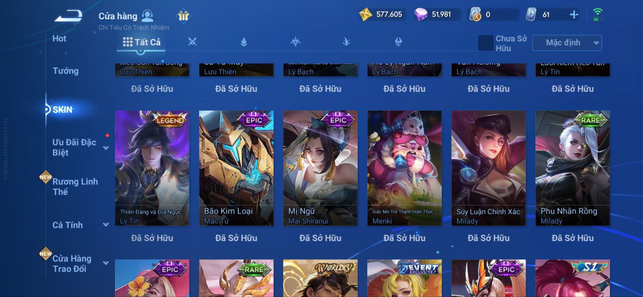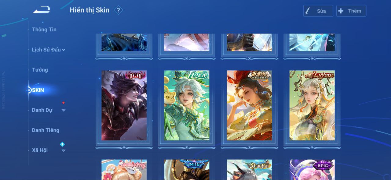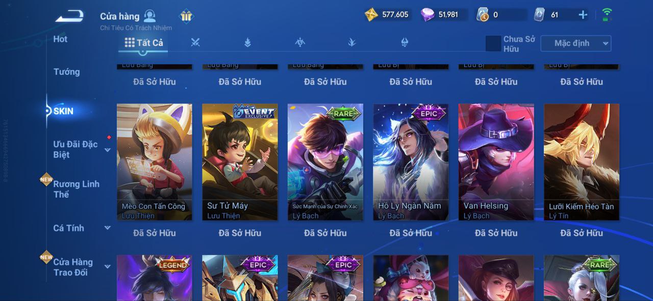 Nổi bật: VM462 - Mythic Hàn Tín, 2 Legend Lý Tín, Allain, 2 Tết 2025 Nữ Oa, Ngu Cơ, 2 Limbo Biron, Đông Hoàng, Stellar Musashi, 2 Sanxingdui Nữ Oa, Hậu Nghệ, 11.11 Bạch Khởi, LNY 2024 Đại Kiều, Flora Sakeer, Tây Du Kí Chân Cơ, Hello Kitty Tiểu Kiều, 2 Limted Kính, Ngọc Hoàn, 60 Epic
