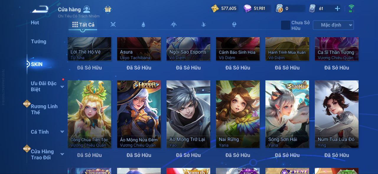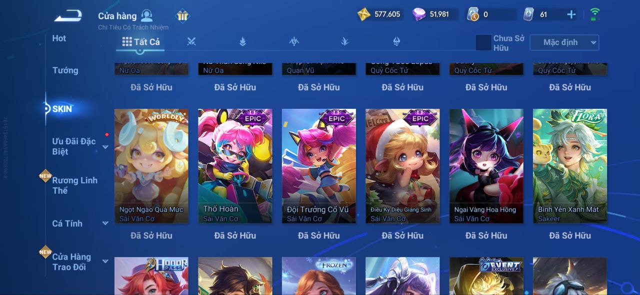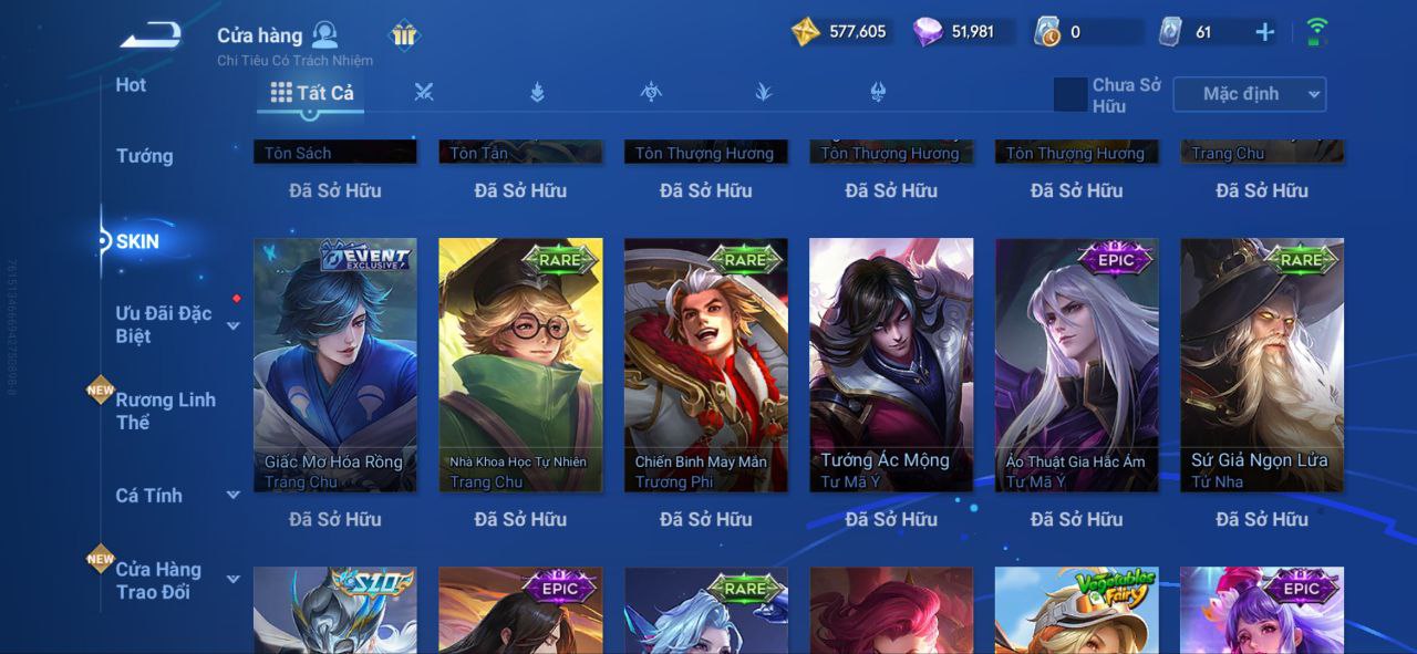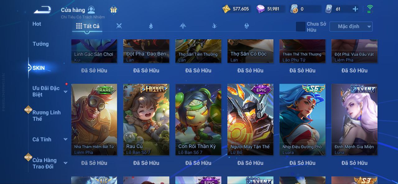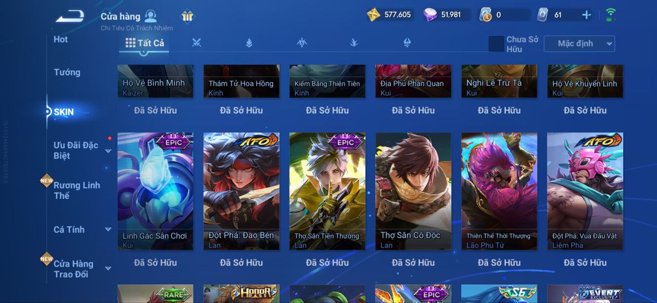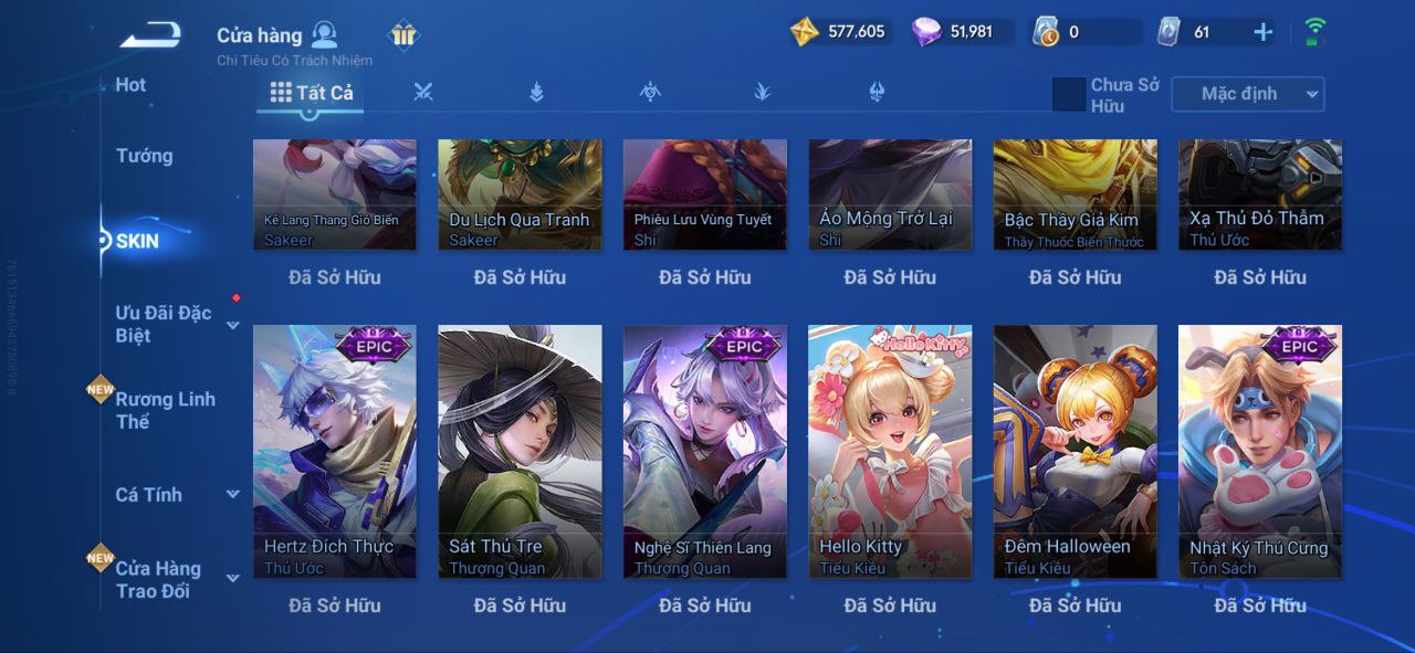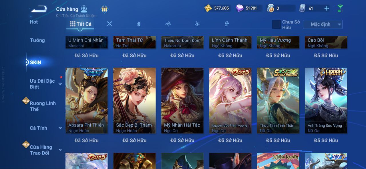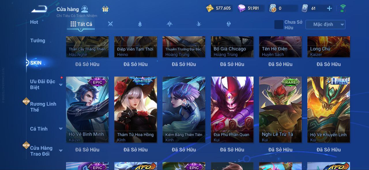 Nổi bật: VM462 - Mythic Hàn Tín, 2 Legend Lý Tín, Allain, 2 Tết 2025 Nữ Oa, Ngu Cơ, 2 Limbo Biron, Đông Hoàng, Stellar Musashi, 2 Sanxingdui Nữ Oa, Hậu Nghệ, 11.11 Bạch Khởi, LNY 2024 Đại Kiều, Flora Sakeer, Tây Du Kí Chân Cơ, Hello Kitty Tiểu Kiều, 2 Limted Kính, Ngọc Hoàn, 60 Epic