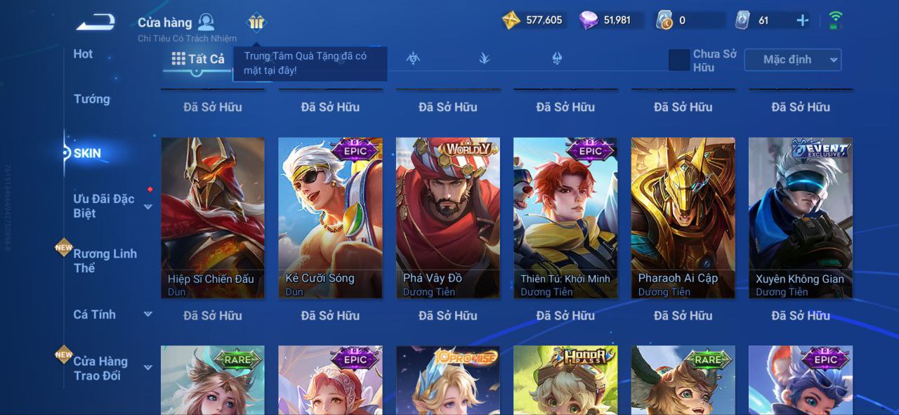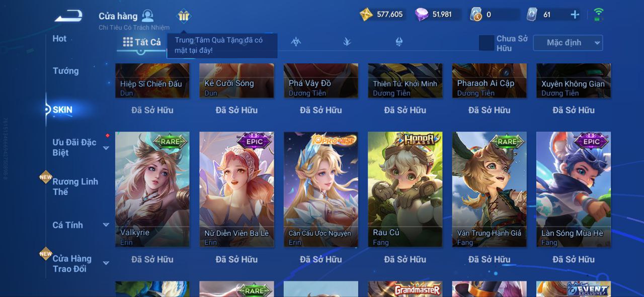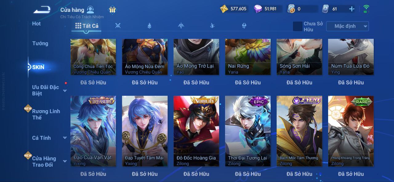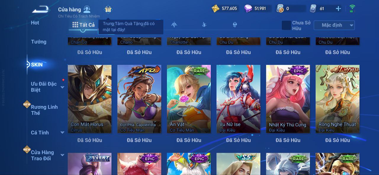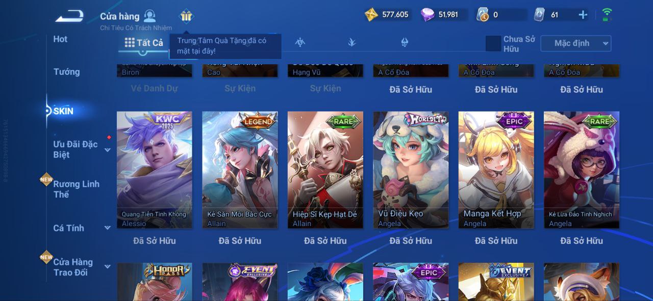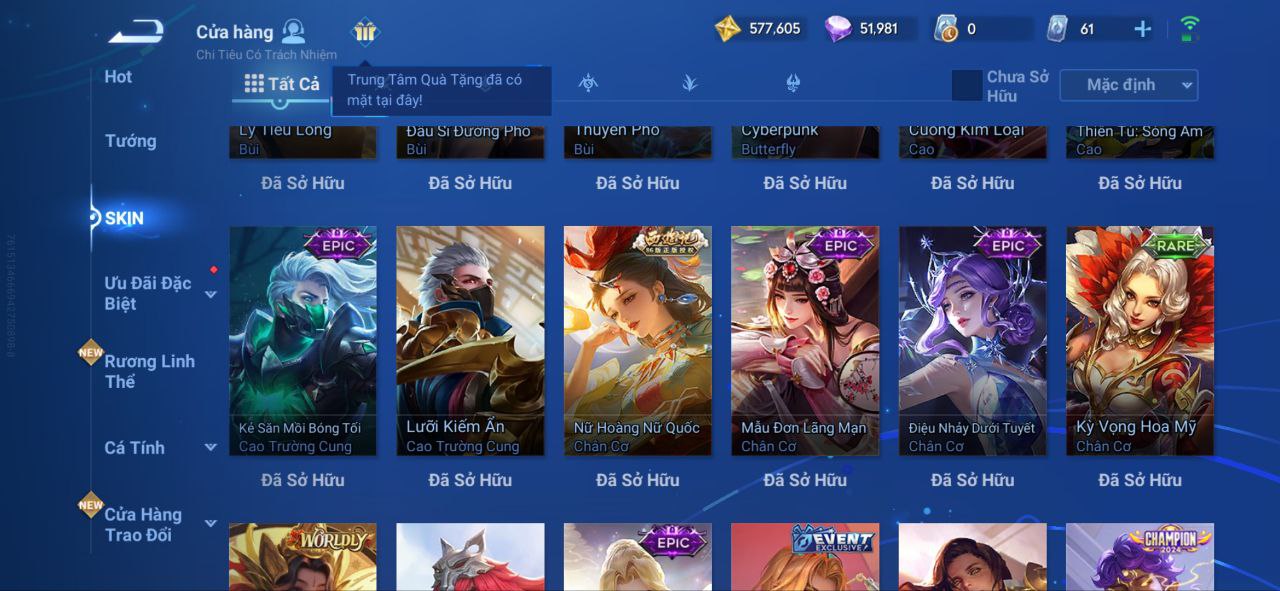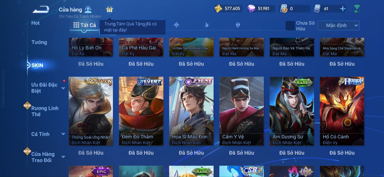 Nổi bật: VM462 - Mythic Hàn Tín, 2 Legend Lý Tín, Allain, 2 Tết 2025 Nữ Oa, Ngu Cơ, 2 Limbo Biron, Đông Hoàng, Stellar Musashi, 2 Sanxingdui Nữ Oa, Hậu Nghệ, 11.11 Bạch Khởi, LNY 2024 Đại Kiều, Flora Sakeer, Tây Du Kí Chân Cơ, Hello Kitty Tiểu Kiều, 2 Limted Kính, Ngọc Hoàn, 60 Epic